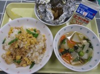 今日の給食は旬のとうもろこしと枝豆を使用した「とうもろこし入り枝豆ごはん」を出しました。色鮮やかなとうもろこしと枝豆の他に、もち米やもちきびも使用し、もちもちとした食感が楽しい混ぜご飯です。
