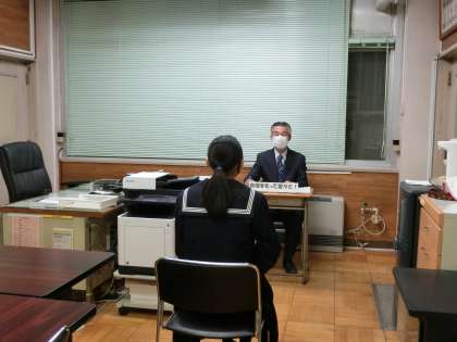 今日から入試本番に向けて、管理職面接(校長先生・副校長先生との面接練習)がスタートしました。管理職の先生との個人面接ということでとても緊張している生徒が多かったのが印象的でもありました。ここまで各クラスで準備してきたものを生かして、管理職の先生との面接に臨んでほしいと思います。「自分の良さ」を伝えられるのは、他ならぬ「自分」しかいません。頑張っていきましょう!!