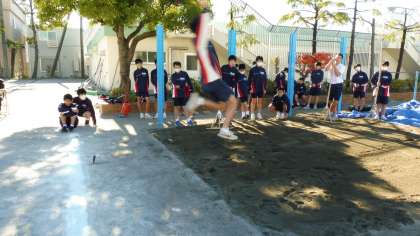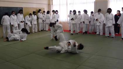女子は格技室で組み合わずに柔道の前回り受け身に