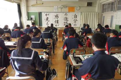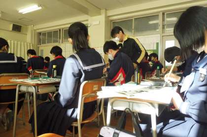 「自分の進路」(楷書)、「感性が光る」(行書)のどちらかを選んで書きます。