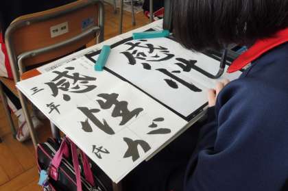 墨のにおいが漂う中、静かに心を落ち着けて書初めの練習です。