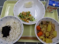 献立:ごはん・牛乳・鮭のゆず香り焼き・切り干し大根和え・田舎汁・りんご 今日は冬至献立です。ゆずの果汁と皮に漬け込み焼いた「鮭のゆず香り焼き」とかぼちゃ入りの「田舎汁」です。厄除けの黄色の食べ物としました。