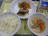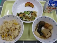 献立:中華混ぜごはん・牛乳・いかのケチャップ和え・中華コーンスープ・プラッドオレンジ プラッドオレンジはまだまだ市販されている量が少ない国産のオレンジです。果肉が赤い色をしているのでプラッド(血)オレンジという名がついたそうです。色はアントシアニンという色素の色でブルーベリーにも入っています。目の疲れに効果的です。