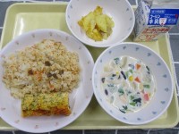 「小松菜ごはん」はごはんに、豚ひき肉のそぼろ、小松菜、炒り卵を混ぜ込んだ混ぜご飯です。