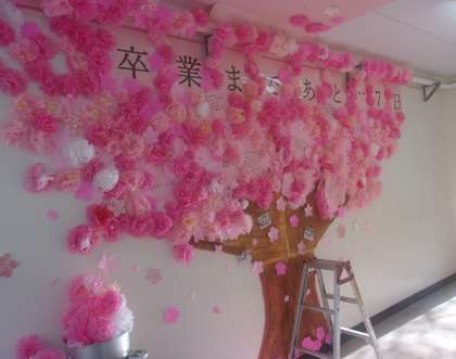 今、8組職員室前廊下には、生徒が花紙で作成した桜の木が生えています。