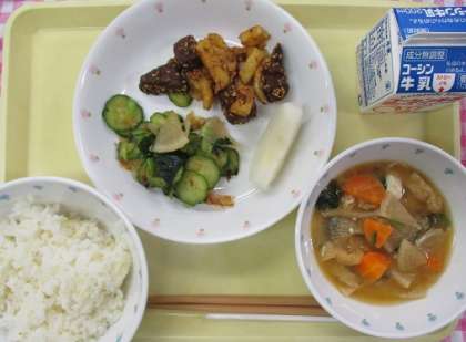 今日の給食は、揚げたレバーとじゃがいもに甘辛いたれとたっぷりの白ごまを絡めた「レバーとポテトの甘辛ごま絡め」を出しました。レバーが苦手な子供も食べやすいメニューです。
