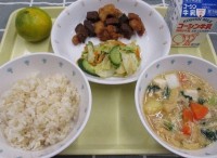 【献立】麦入りご飯チキンたれかつ野菜のおかか昆布和えごま白玉汁 今日の給食の「チ...