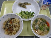 【献立】深川飯わかさぎのセサミ揚げキャベツときゅうりのゆかり和えつみれと水菜のは...