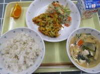 【献立】美唄とりめし厚揚げの香味炒め鱈の小鍋仕立て汁果物(清見) 今日の給食の「...