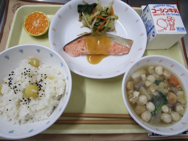 栗ごはん 鮭の塩こうじ焼き西京みそかけ きゃべつと小松菜のおひたし のっぺい汁 みかん 牛乳