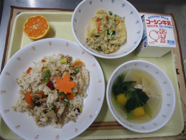 吹き寄せごはん 揚げ豆腐の野菜たまごあんかけ かぼちゃ白玉団子汁 みかん 牛乳