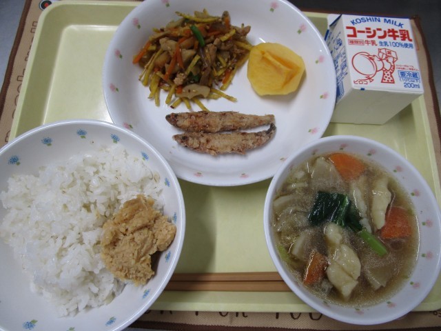 ごはん 鉄火味噌 わかさぎのから揚げ さつまいもの五目きんぴら 豆腐すいとん汁 牛乳