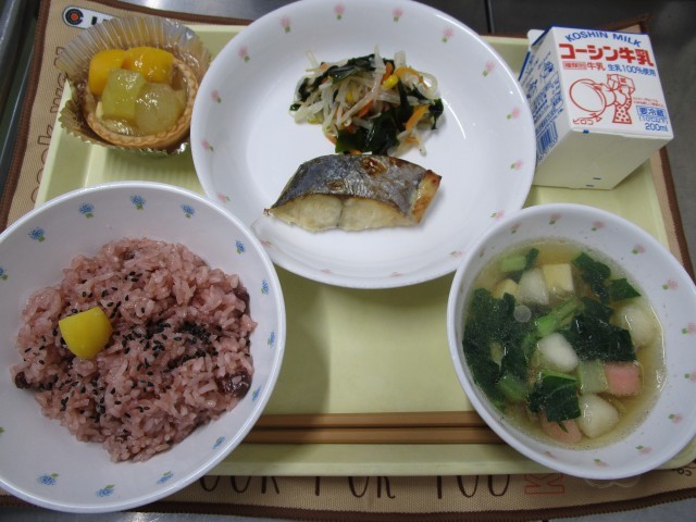 明日は松江二中の78回目の開校記念日です。今日は、お祝いの栗入り赤飯と手作りカスタードのフルーツタルトでお祝いしました。