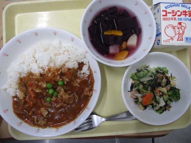 ポークハヤシライス ひじきと野菜のマリネ ぶどう寒天ポンチ 牛乳