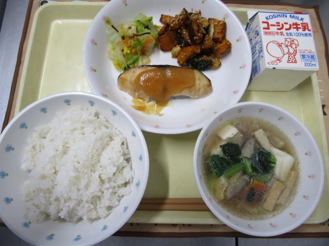 ごはん 白菜の浅漬け 鰆のゆずみそ焼き かぼちゃと大豆とじゃこの揚げ煮 けんちん汁 牛乳