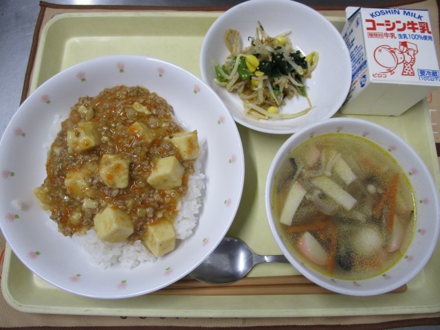 マーボー丼 もやしの中華和え 中華きのこスープ 牛乳