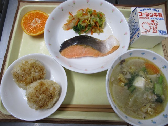 焼きおにぎり 鮭の塩焼き 白菜のおかか和え 豚汁 みかん 牛乳