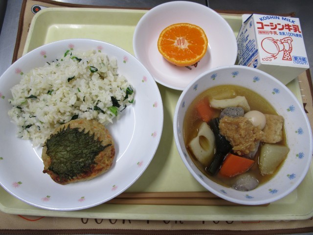 給食ではいわしをさんが焼き、おでんには大豆みそを入れました。しっかり食べて一年間健康に過ごしましょう。