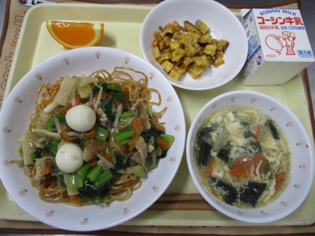小松菜あんかけ焼きそば 大豆とさつまいもの揚げ煮 わかめとたまごのスープ 清美オレンジ 牛乳