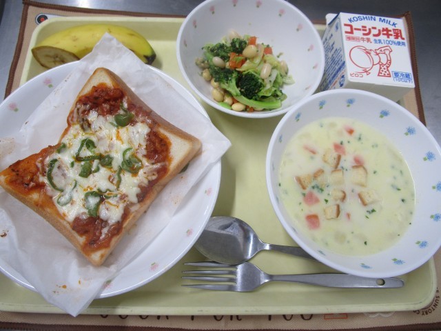 ピザトースト 豆まめサラダ コーンスープ バナナ 牛乳