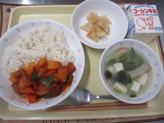 五穀米 酢豚 大根の華風漬け チンゲンサイのスープ 牛乳