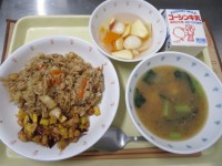 呉汁の呉とは、大豆を水に浸しすりつぶしたもので、呉をみそ汁に入れたものを呉汁といいます。給食では、水で戻して茹でた大豆をミキサーにかけて入れています。豆乳を使用すると呉汁風のみそ汁が味わえます。