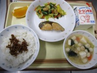 ビスキュイはフランス語で、小麦粉にバターや卵を加えて焼いたクッキーのことで、ビスケットと同じ意味だそうです。給食では、小松菜を練りこんだクッキー生地をパンに塗り、オーブンでサクッと焼きました。アーモンドと小松菜の風味も楽しめるパンです。おまけのパンは、じゃんけんで仲良く分けていました。