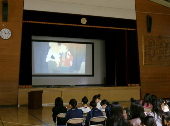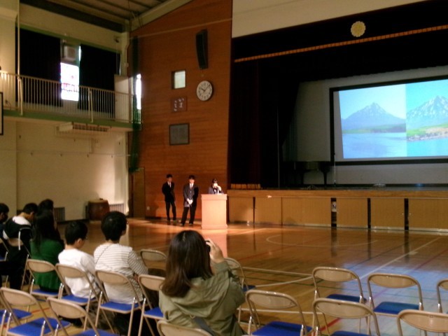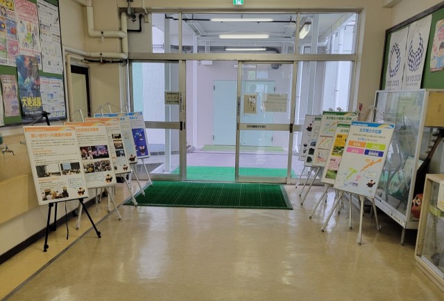 現地視察学習会の体験報告会と映画「ジョバンニの島」の上映会を行いました。また、都民会議の方からお借りしたパネルを展示し、北方領土問題に少しでも関心をもってもらう取組をしました。