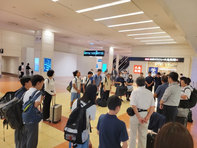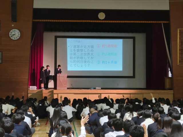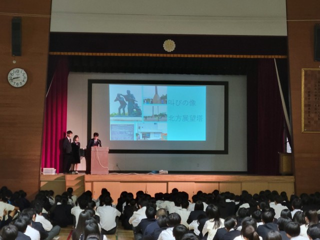 ○全校朝礼(R7.10.27) 全校生徒に向けて、現地視察学習会の体験報告会を行いました。聞き手の生徒たちは、静かに真剣に耳を傾けていました。