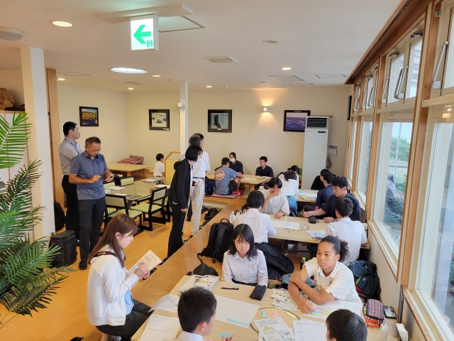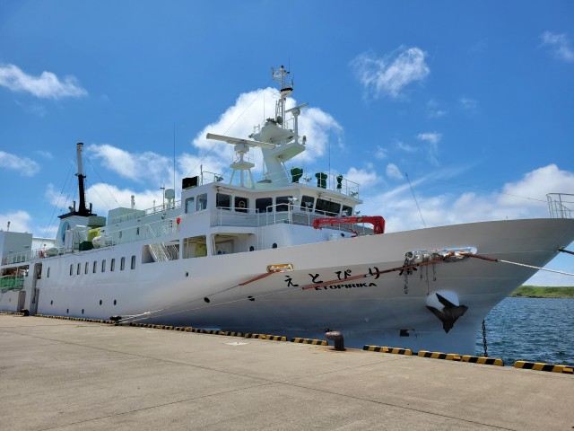 初日は、早朝に発生したカムチャッカ半島の地震による津波警報で出発できるか不安でしたが、ほぼ定刻通りに出航しました。しかし、現地では海沿いの国道が封鎖され、元島民の方の話や施設見学が中止となり、バス移動中のDVD(元島民の話)での学習が中心となりました。
