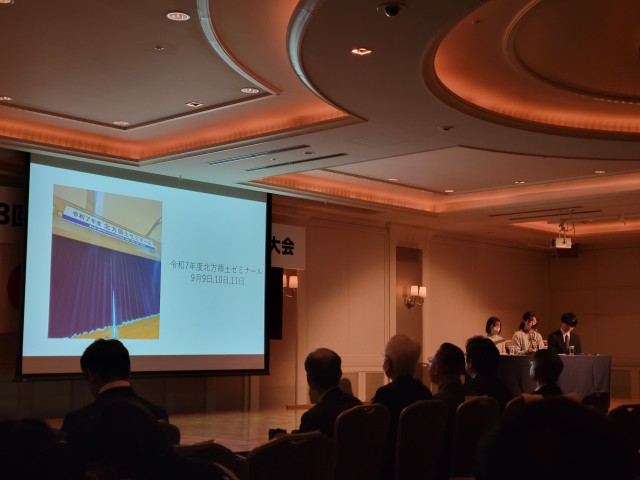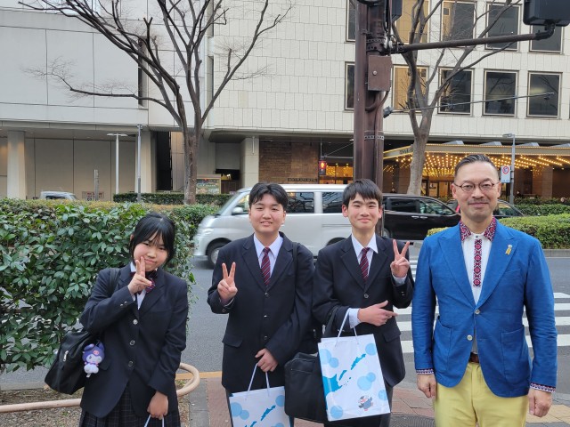 ウクライナと関係の深い神戸学院大学教授の岡部氏による記念講演の後、R7現地視察事業参加者である本校2年生3名と筑波大附属中2年生2名が代表として、訪問報告の発表を行いました。”この問題を風化させないために、私たちが学んだことを発信することが大切である”と立派に主張していました。そのあと、大学生対象の北方領土ゼミナールの報告も聞き、改めて私たちが何をすべきかを考えるようになったようです。帰り道に、偶然前を歩いていた岡部氏に声をかけ、記念撮影をさせてもらいました。