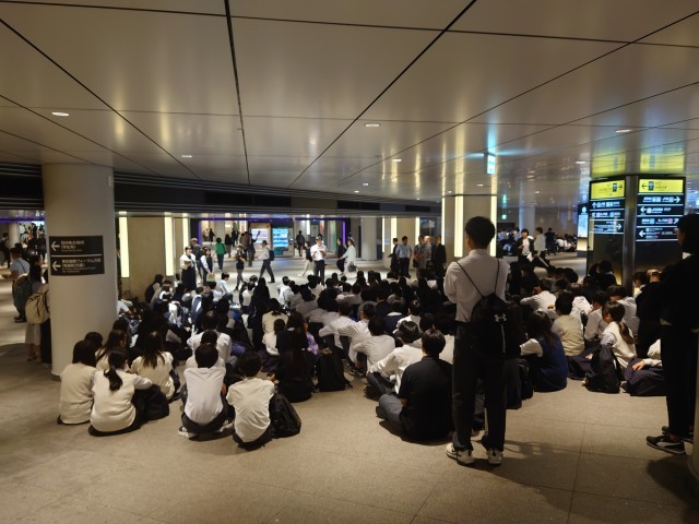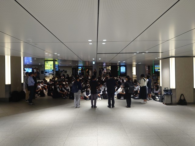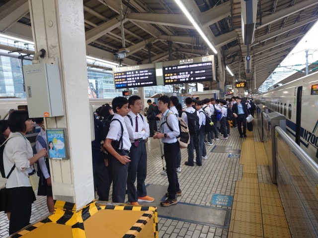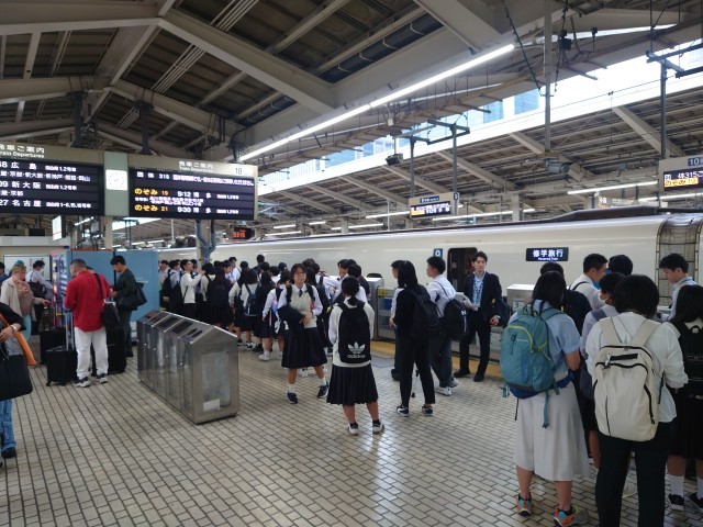 予定通り東京駅に集合しました。東京駅は修学旅行に向かう学校でいっぱいです。今日は奈良の法隆寺と奈良公園に行きます。予定通り新幹線が出発しました。奈良県の天気は曇り時々雨の予報です。