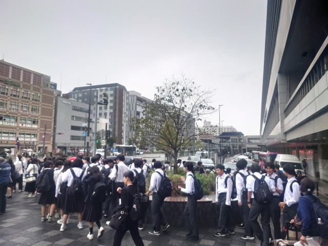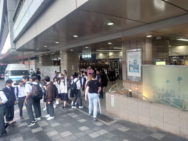 新幹線は予定通り京都駅に到着しました。京都は半袖だと肌寒いくらいで、雨が降っています。このあとバスで移動します。