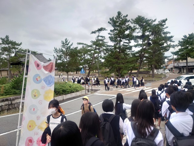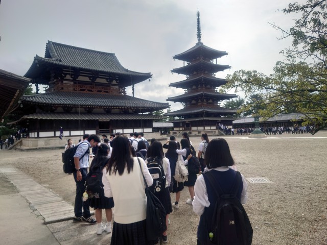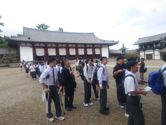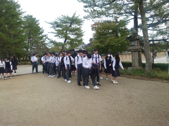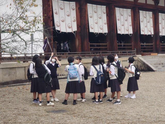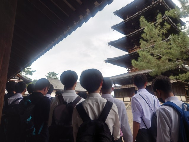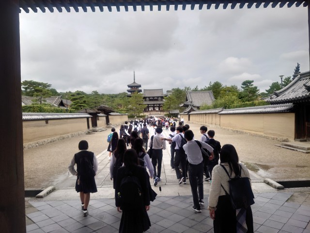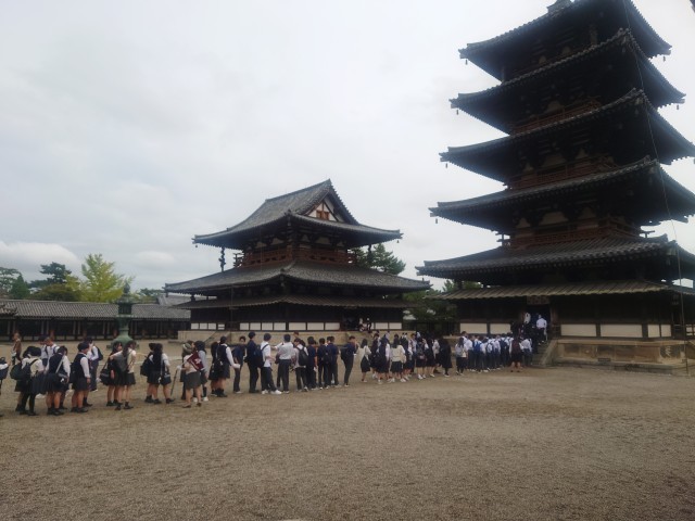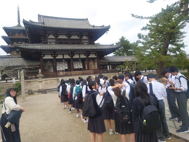 世界最古の木造建築と知られる法隆寺です。すっかり雨も上がり良い天気です。東京よりも蒸し暑さを感じますが、生徒たちはガイドさんの話を聞きながら国宝や重要文化財などを見学しました。みんな元気です。このあと奈良公園に向かいます。
