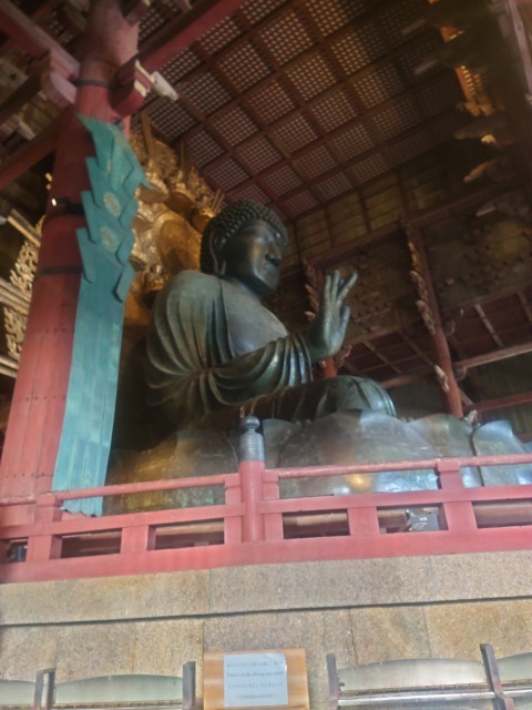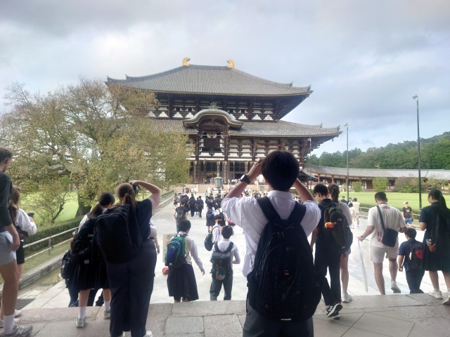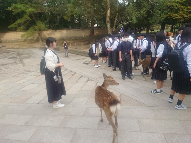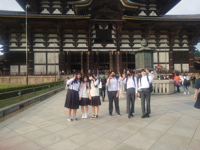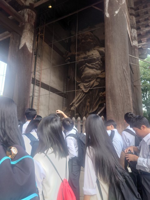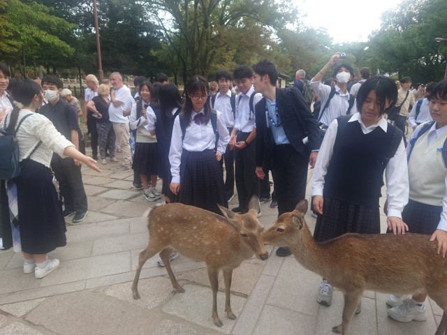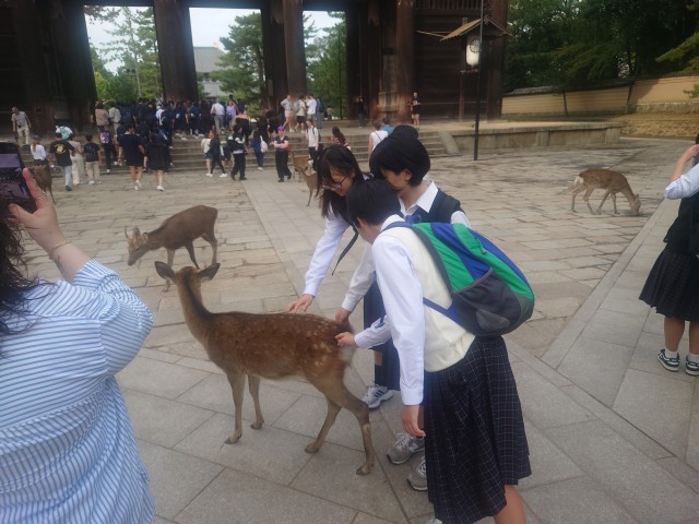 奈良公園に来ました。鹿せんべいを買ってあげている人がたくさんいます。鹿の圧力に押され、いろいろなところで悲鳴のような声が聞こえてました。世界遺産に登録されている東大寺大仏殿を班行動で見学しました。このあと宿にに向かいます。