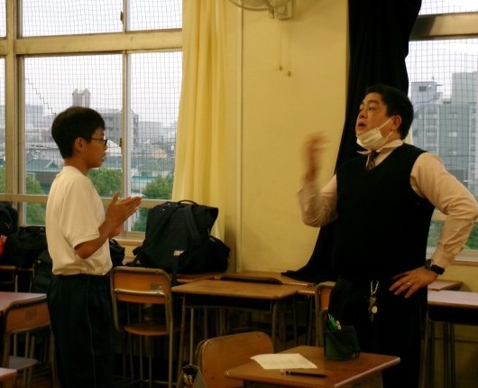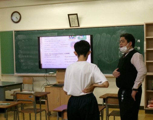 途中、リッキー先生から、「書いてある文章を読むのではなくて、どんな場面で会話しているかを想像してみよう。」という言葉かけがあり、生徒は次第にワークシートがなくても、会話練習ができるようになっていきました。