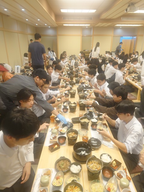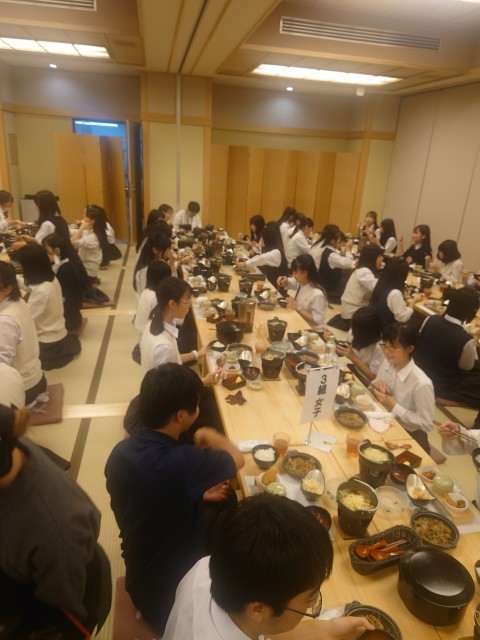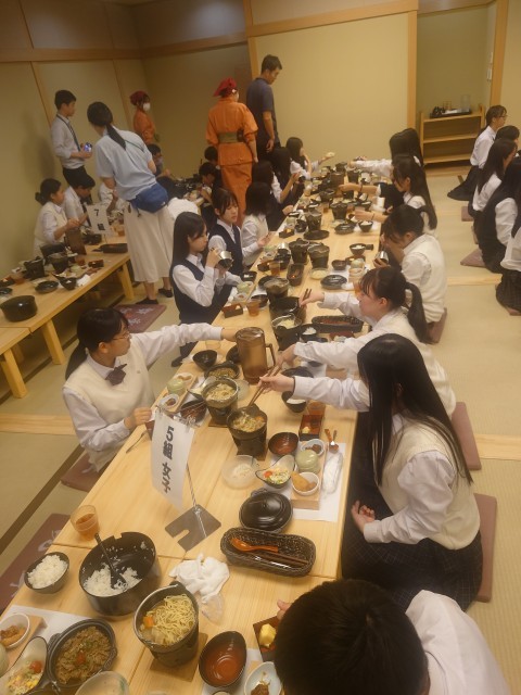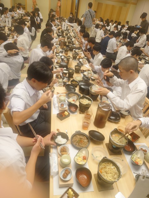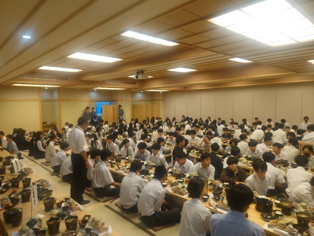 旅館GINKAKUに到着して、入館式後すぐに食事になりました。旅館GINKAKUは京都駅から徒歩3分で綺麗にリニューアルされたとても素敵な旅館です。生徒たちは東京からの移動と、法隆寺、奈良公園とよく歩いたので疲れたと思います。よく食べました。