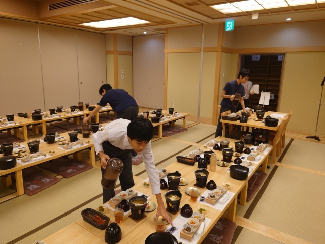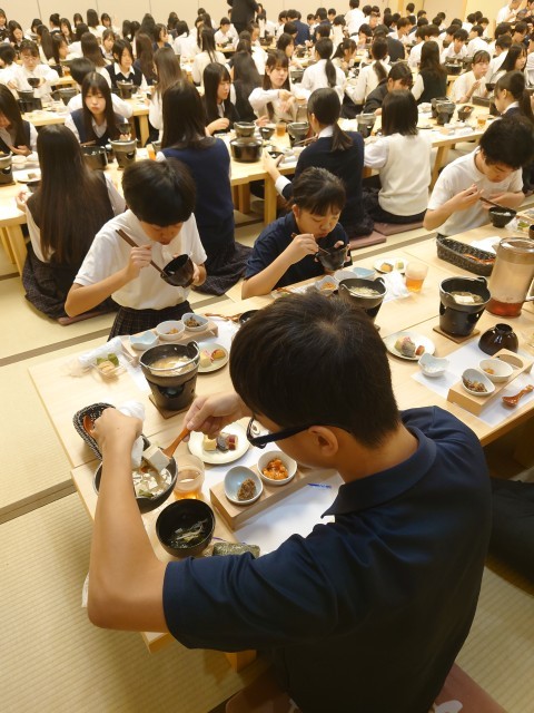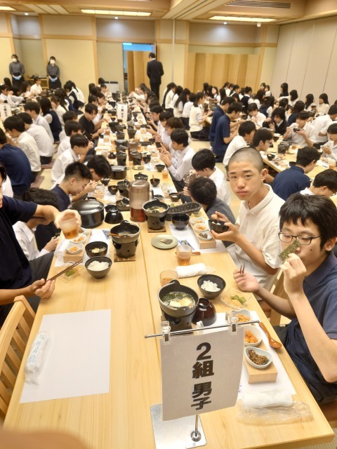 おはようございます。今朝の京都は雲一つない快晴で、今は空気も気持ち良いですが気温が上がってきそうな感じがします。予想最高気温は29度です。2日目の朝食は眠そうでしたが元気に起きてきました。早くから食事係の生徒が準備をしてくれています。今日は1日京都市内の班行動になります。どんな顔して宿に戻ってくるか楽しみです。このあと出発になります。