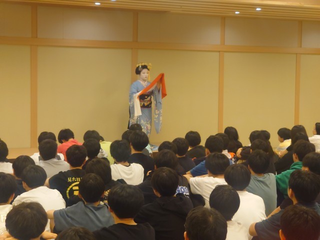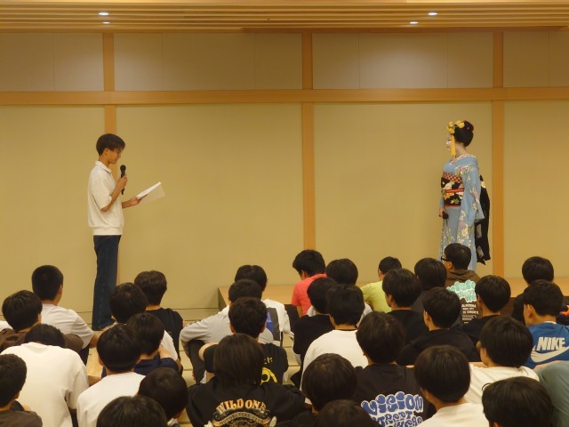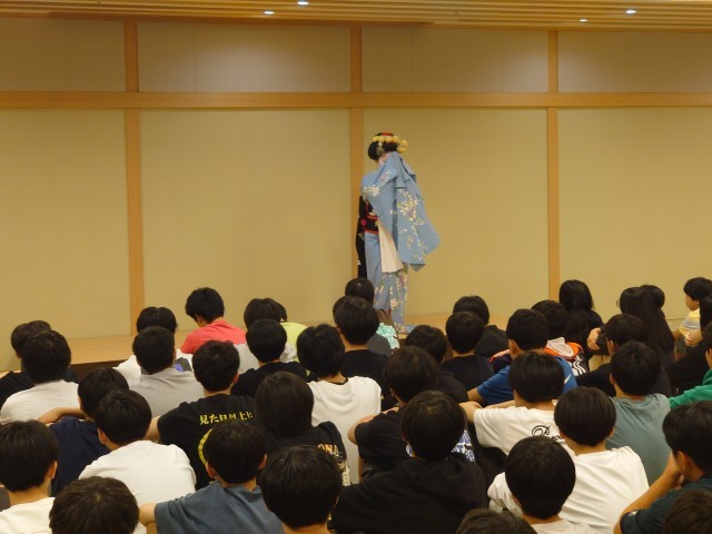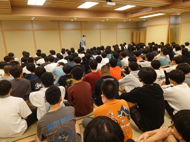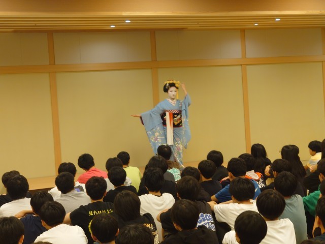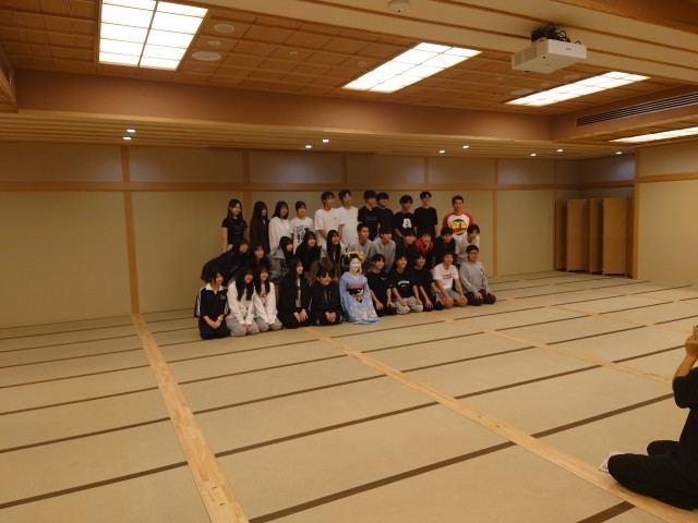 最終日の夜は舞妓鑑賞をしました。六段くずし他の計2曲を披露してくださいました。初めて見る姿に生徒の表情は真剣でした。最後は質問コーナーとクラス写真を撮って終わりました。皆さんの心に残る貴重な経験になると良いです。このあとは就寝準備になります。