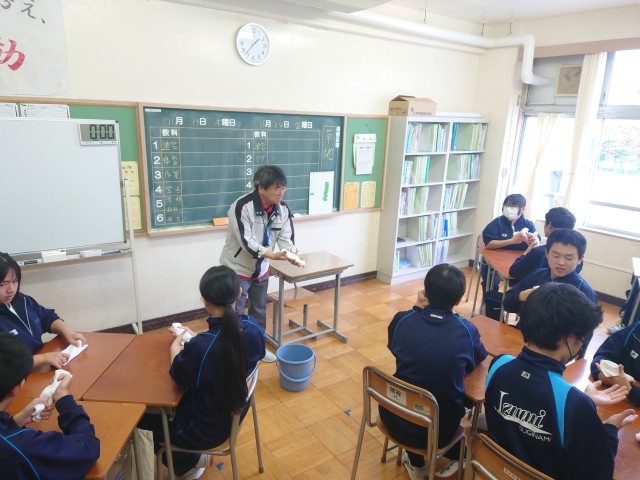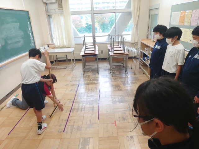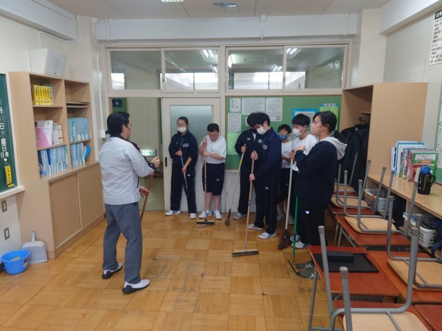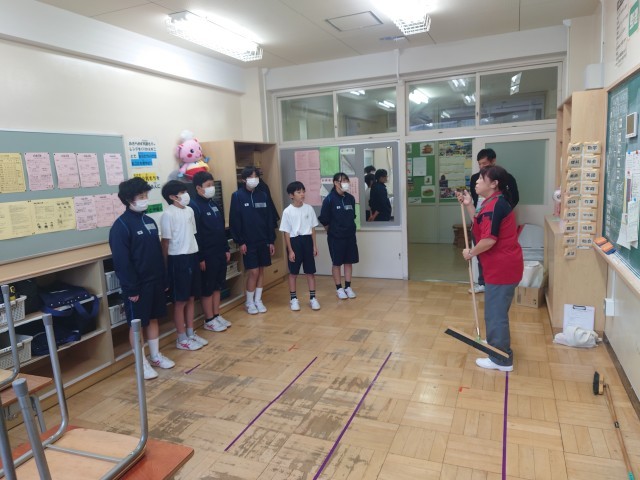 7組では、東京ビルメンテナンス協会から5名の清掃専門指導員の方々にお越しいただき、使用するほうきの特徴と効果的な使い方、ぞうきんの絞り方など様々な効率の良い清掃についてご指導いただきました。専門家だからこその説明があり、なるほど!と思うことがたくさんありました。
