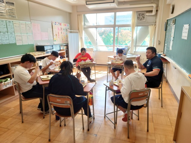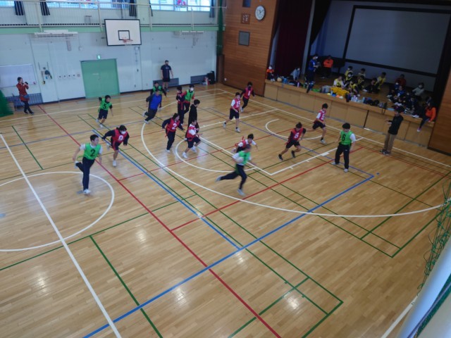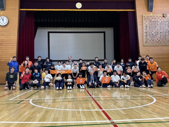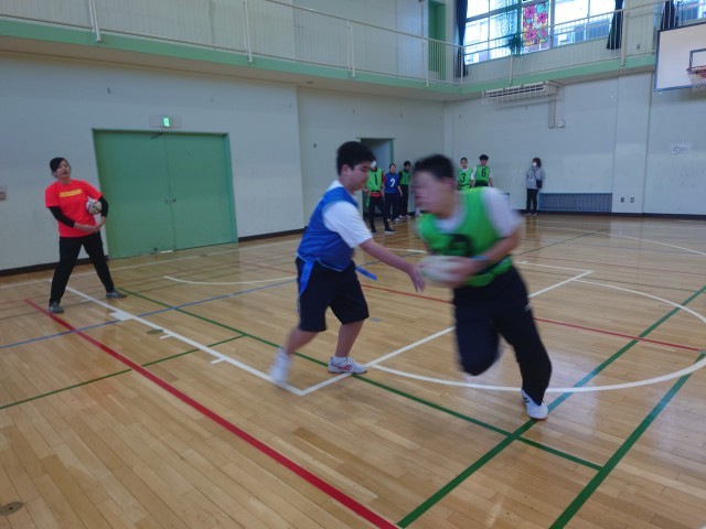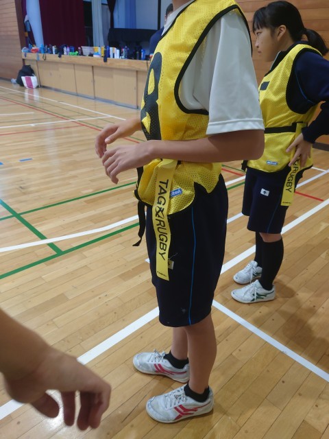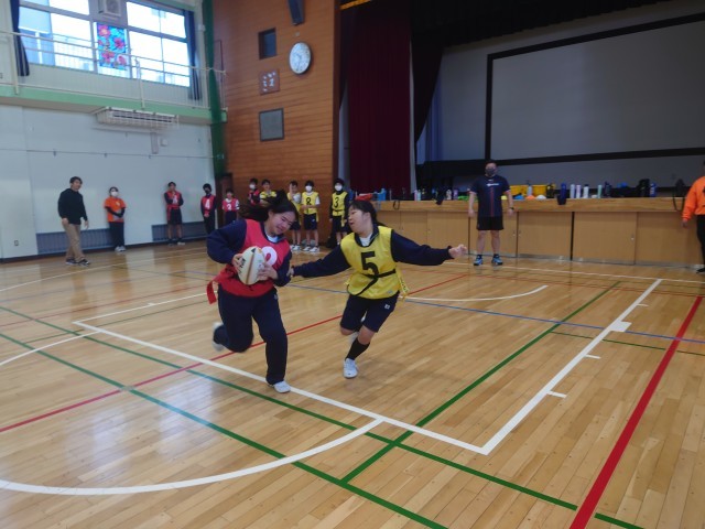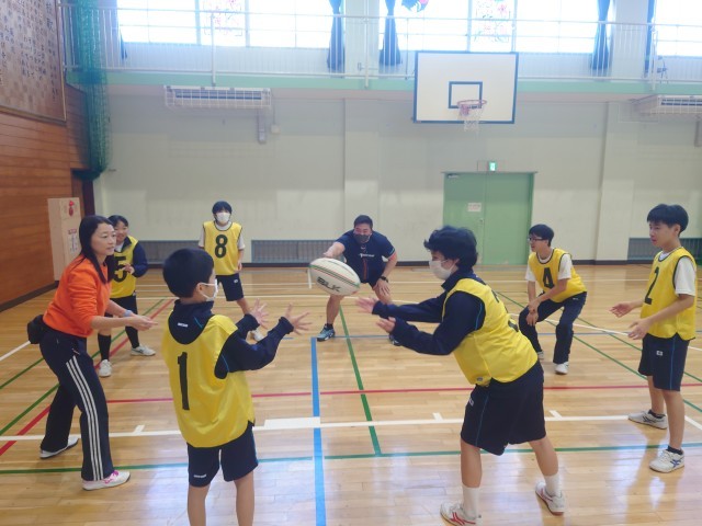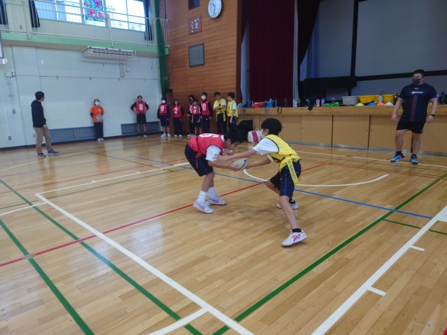 今日はクボタスピアーズのタグラグビー教室が行われました。タグラグビーとはタックルの代わりに身体につけたタグを取る事で、相手の動きを封じるゲームです。ウォーミングアップはラグビーボールを使ったパスリレーから始まりました。その後は1対1や2対2を行い、最後は4チーム総当たり戦のゲームをしました。相手にタグを取られないようにトライを目指して、ボールを運んだりパスをしたりしました。生徒は熱心にとっても良い汗をかいていました。最後は記念写真を撮って給食を一緒に食べとっても充実した1日となりました。12月は1年生を対象にタグラグビー教室を予定しています。