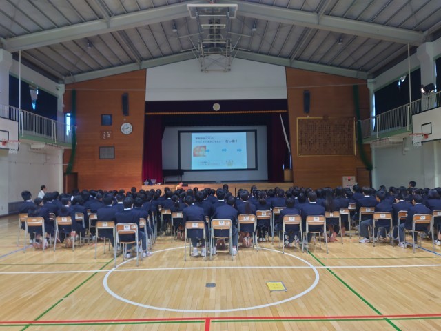 今日は学校歯科医の柵山先生と歯科医師会から高田先生にお越しいただき歯科指導を行いました。江戸川区の中学生は、3人に1人が虫歯、5人に1人が歯肉炎とのことです。永久歯が生えそろう年齢ですから、歯磨きをしっかりして、一生使う歯を大切にしたいですね。