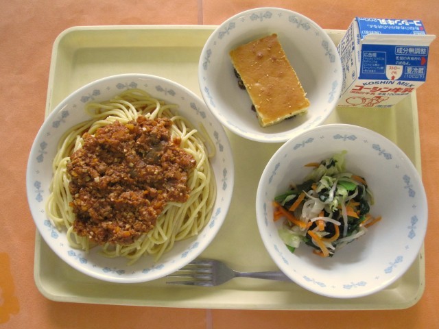 今日は世界の料理からイタリアを取り上げました。ボロネーゼスパゲティは酸味がしっかり飛んだ濃厚な味です。あるクラスでは10人ほどの生徒がお代わりの列をなして、山盛りのめんにソースをかけてもらっており、皿からあふれんばかりの盛り具合に思わず笑ってしまいました。