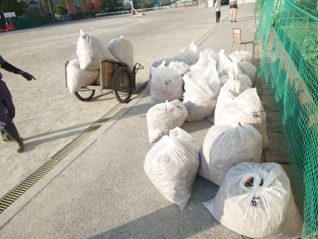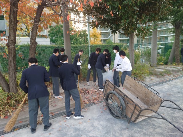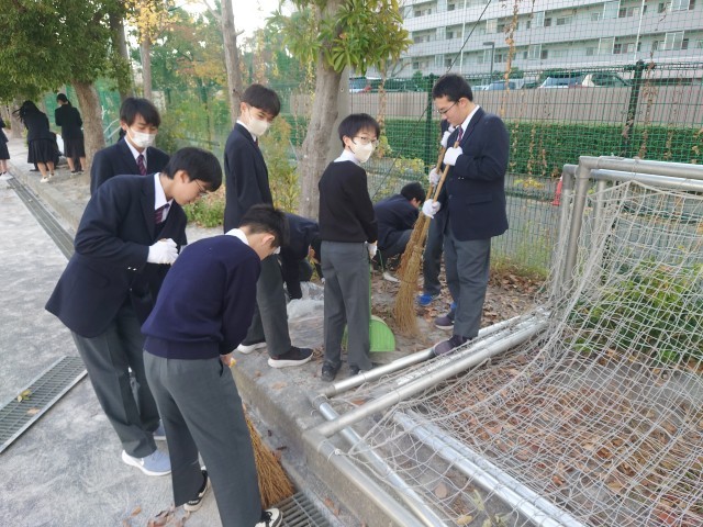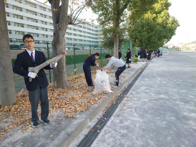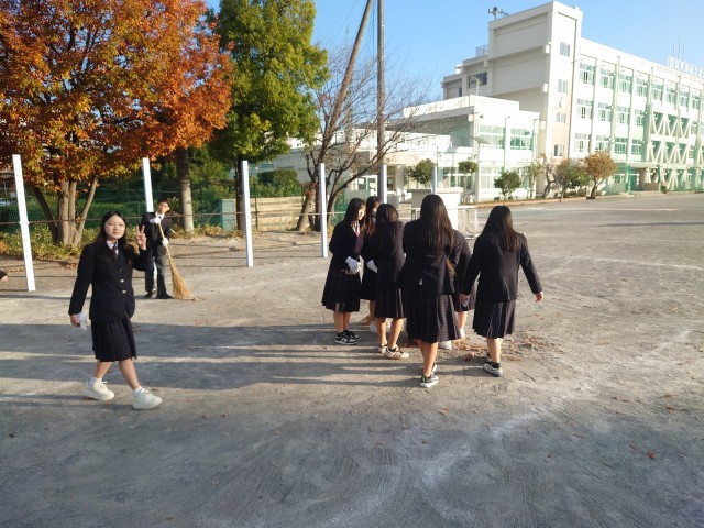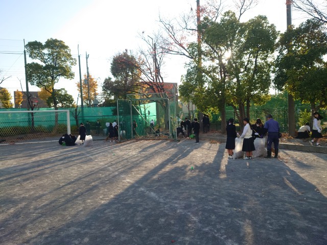 生徒会主催の落ち葉拾いボランティアの2日目です。今日は校庭周りの落ち葉拾いを行いました。2日間で総勢235名の生徒が気持ちよく参加してくれていました。ありがとうございました。