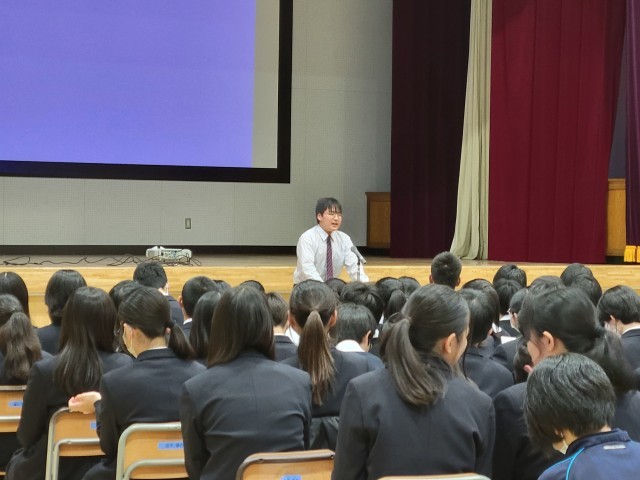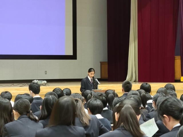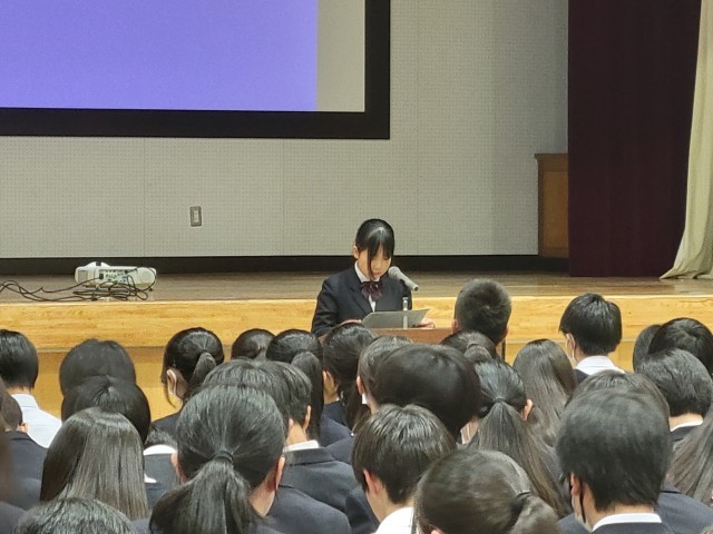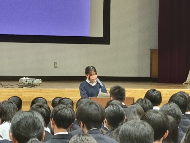 先日、3年生の弁論発表会に参加し、いろいろな考えに触れた2年生各クラスの代表者が発表会を行いました。