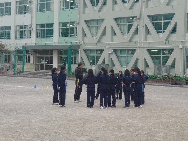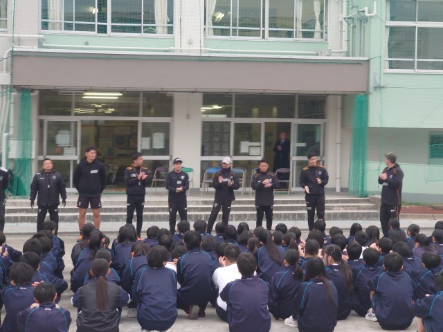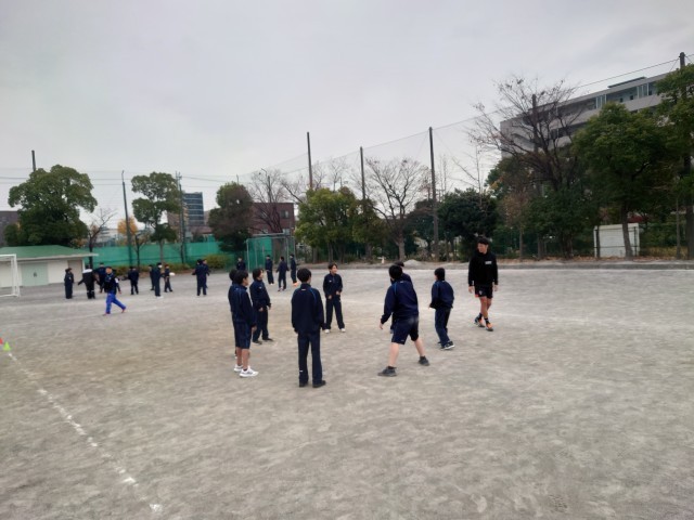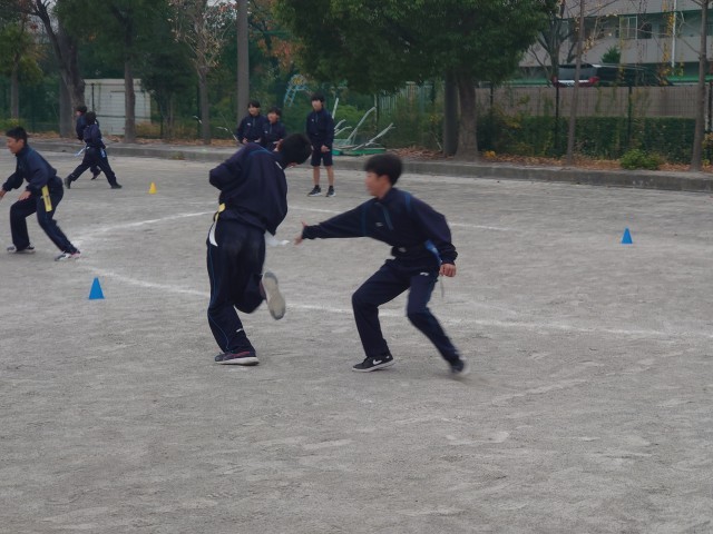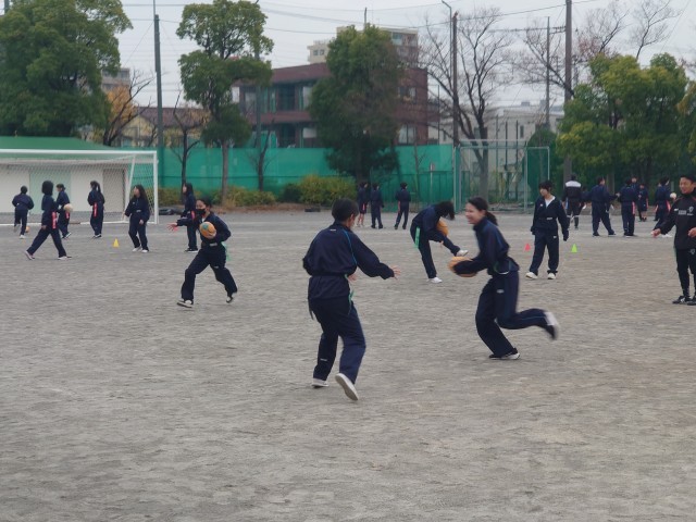 今日はクボタスピアーズから8名のスタッフの方にお越しいただきタグラグビー教室を行いました。以前に2学年、7組が実施しましたが、今日は1学年が対象です。タグラグビーはラグビーのタックルの代わりに腰につけたタグを取るというスポーツです。二之江中では体力の向上も課題の1つです。タグラグビーの運動量はサッカーを超えてスポーツの中でもトップクラスの運動量を誇ります。そんなタグラグビーですが、生徒は楽しそうに取り組んでいました。教員チームも一緒に楽しみ、最後は学年の合言葉「ワンチーム!」の掛け声で記念撮影、そして給食を一緒に食べました。