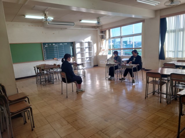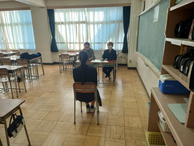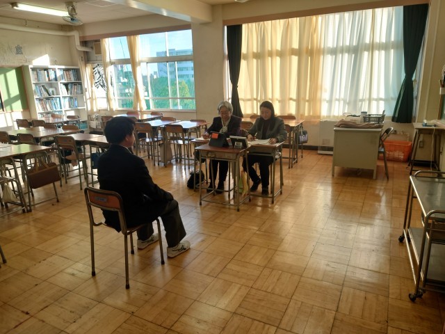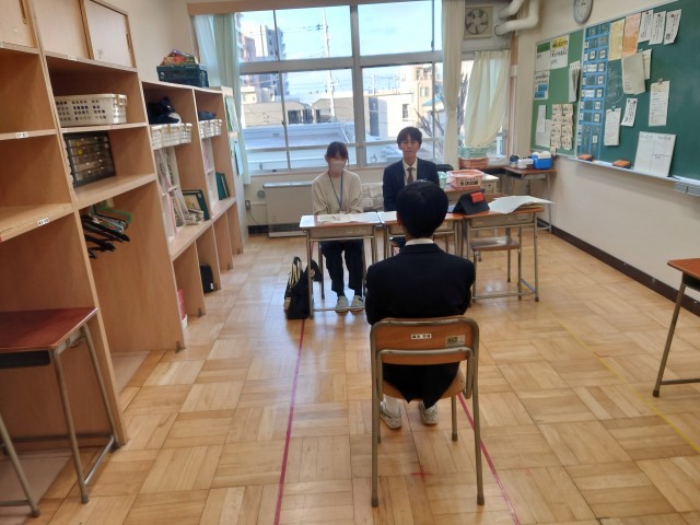 模擬面接2日目が行われました。2日間にわたり民生児童委員と学校運営協議会委員の皆さんにお越しいただき、3年生の面接対策を行っていただきました。模擬面接を通してなぜその学校を志望するのか、入学して何がしたいのか、自分の考えを自分の言葉できちんと話すことの大切さを教えていただきました。また、服装や頭髪など第一印象の大切さも含めて、厳しくも心温まるご指導をいただきました。ありがとうございました。