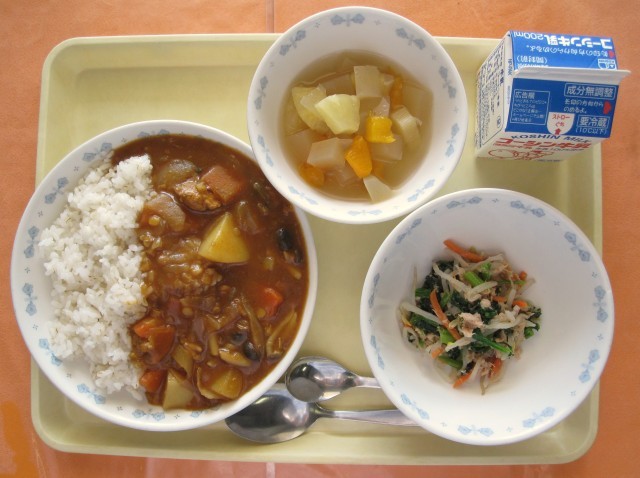 初日の献立は、三年生のリクエストから「チキンカレーライス」「こまツナサラダ」を提供します。皆さんからもらったリクエストの中には、カレーや揚げパンなどの人気メニューの他にも、スープやみそ汁、サラダなどのメニューが複数入っていました。その中でも、サラダで一番票が多かったのが「こまツナサラダ」です。