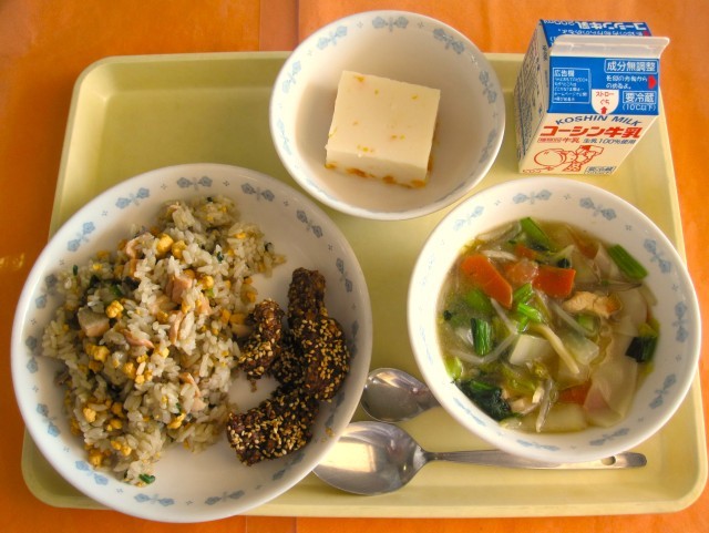 今日は鮭とたまごのチャーハンです。いつもより多めの油で炒った炒り卵がチャーハンらしい風味を作っています。今日はきれいな橙色の炒り卵と、桃色に焼き上がった鮭、にらの緑、ごはんの白が彩り豊かに仕上がっています。食事には様々な色の食材をバランスよく取り入れると、栄養バランスが整う、という説がありますが、レバーの赤、緑や黄で鮮やかな中華スープ、牛乳寒天の白と、今日の給食は華やかです。目からも楽しみながら栄養いっぱいの給食を食べてまた来週も元気に登校してもらえたら嬉しいです。
