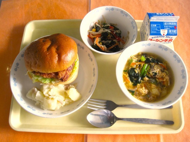 今日の竜田揚げサンドは、パンがふわふわで食感がよかった、と複数の先生から感想をいただきました。調理室で、朝一番からパンに切り込みを入れ、ざるにならべて回転釜でしっかりと蒸しあげて、蒸気の水分と熱をパンに含ませています。600個近い数のパンを手作業で仕込み、他の調理を並行して進めるのはとても大変ですが、美味しさのための一手間を省かずに、今日も調理員さんたちが朝早くから全力で作ってくれました。お代わりの手もたくさん挙がり、お休みの多い学年でも配り切れるほどの人気ぶり。担任の先生が、クラスからパンのお代わりを集め、生徒に行き渡らせてくれました。